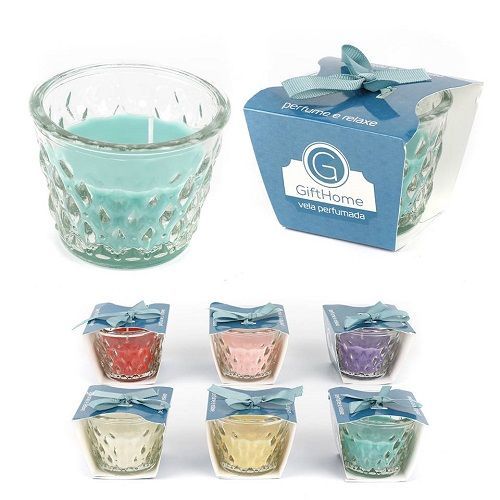 MATERIAL VELA AROMATIZADA VASO EM VIDRO COM RELEVO.<br>MEDIDA 5,5X5CM<br>VEL-212